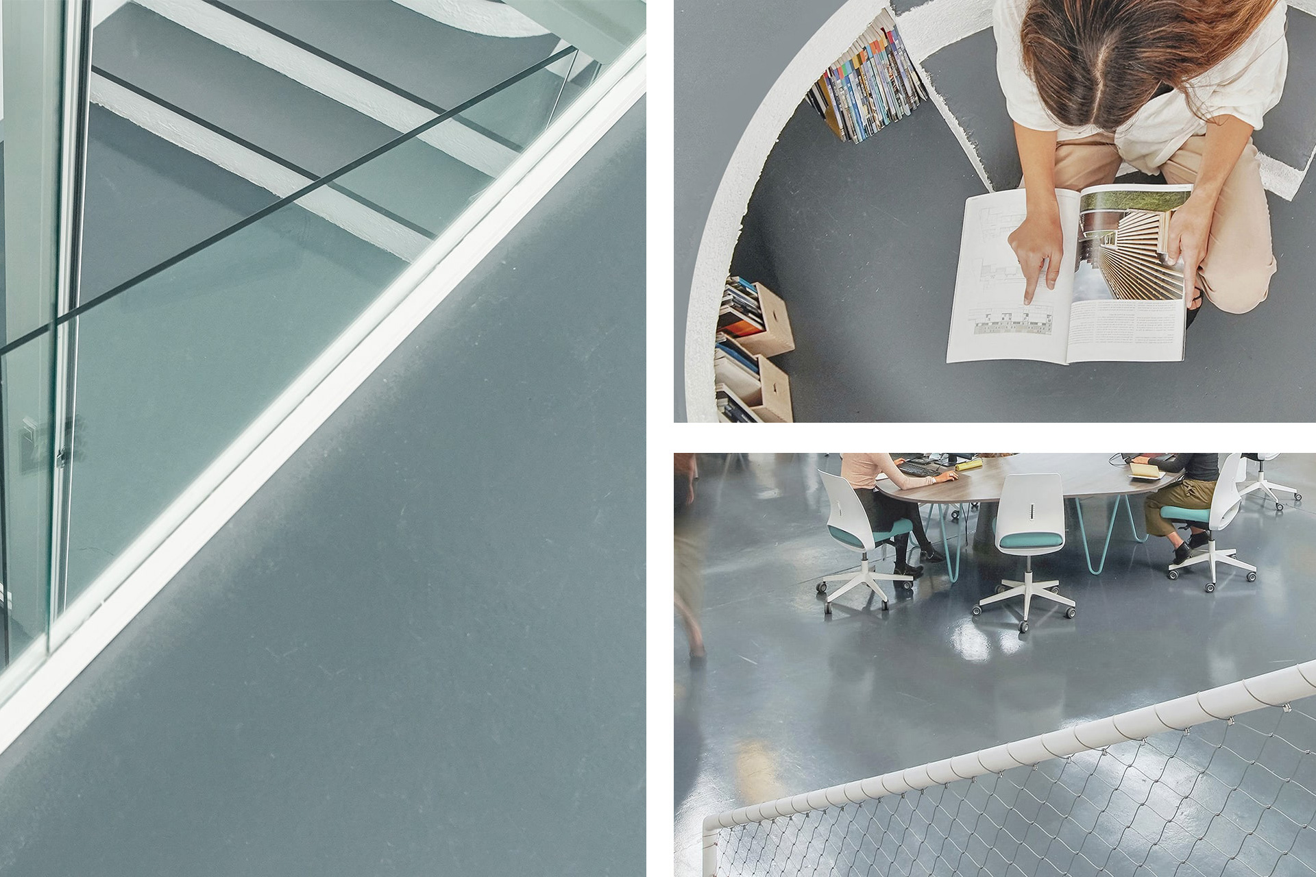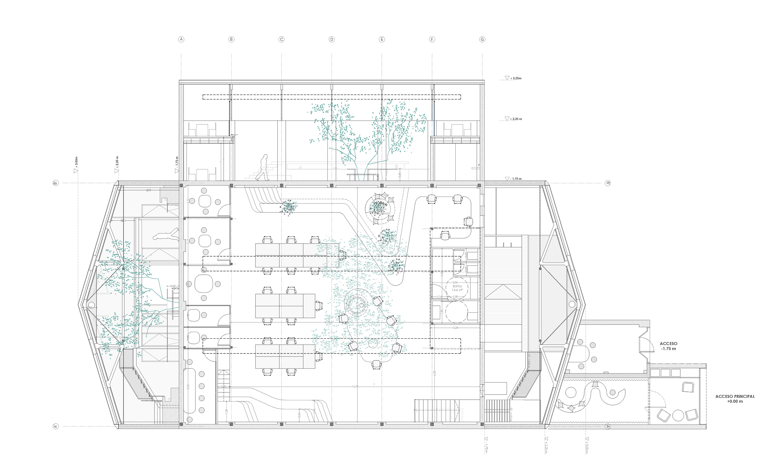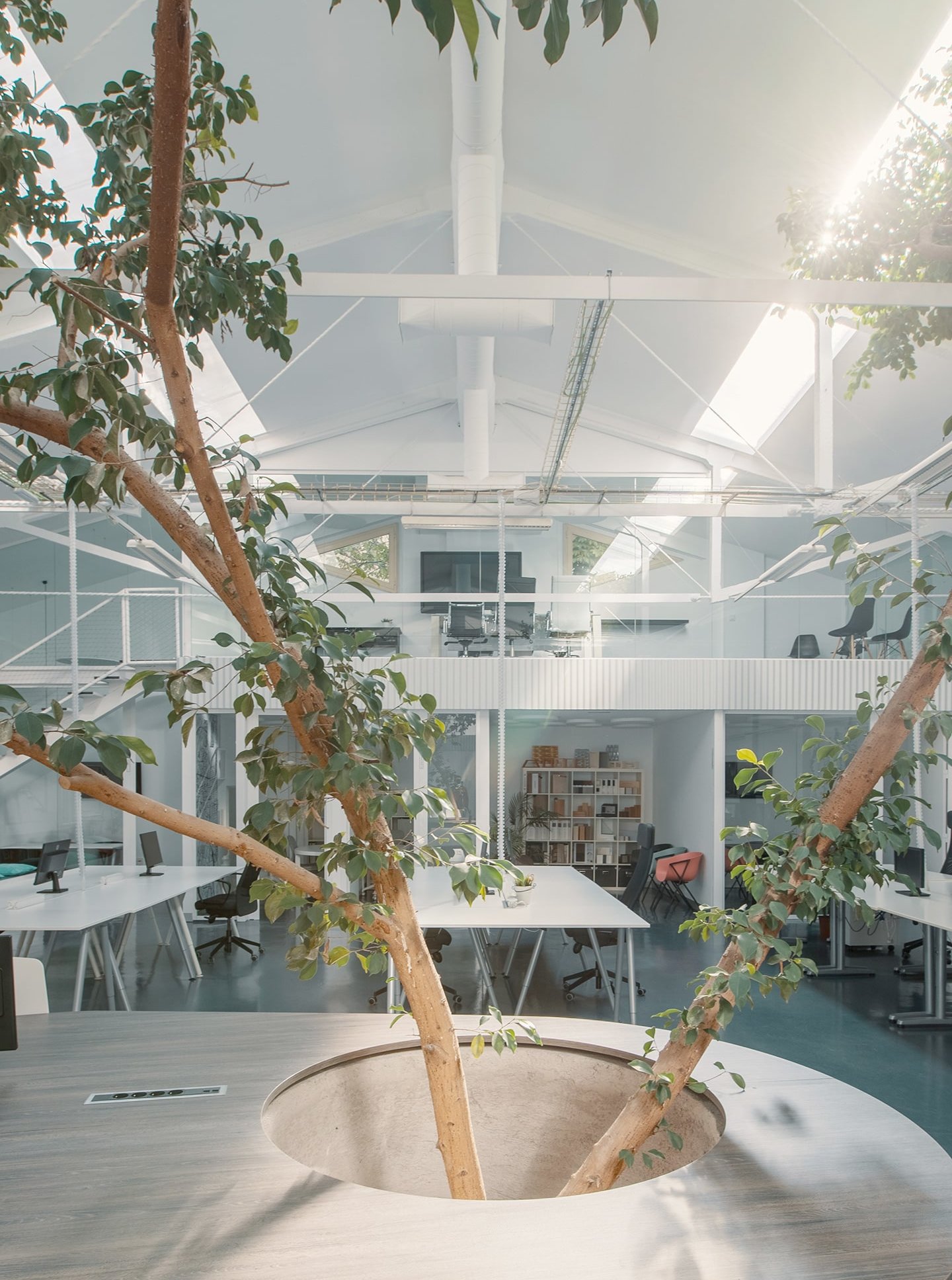 The different levels, the transparency and the green elements were the main tools used to configurate the spaces inside the office, what allowed to respect the industrial heritage of the place.
