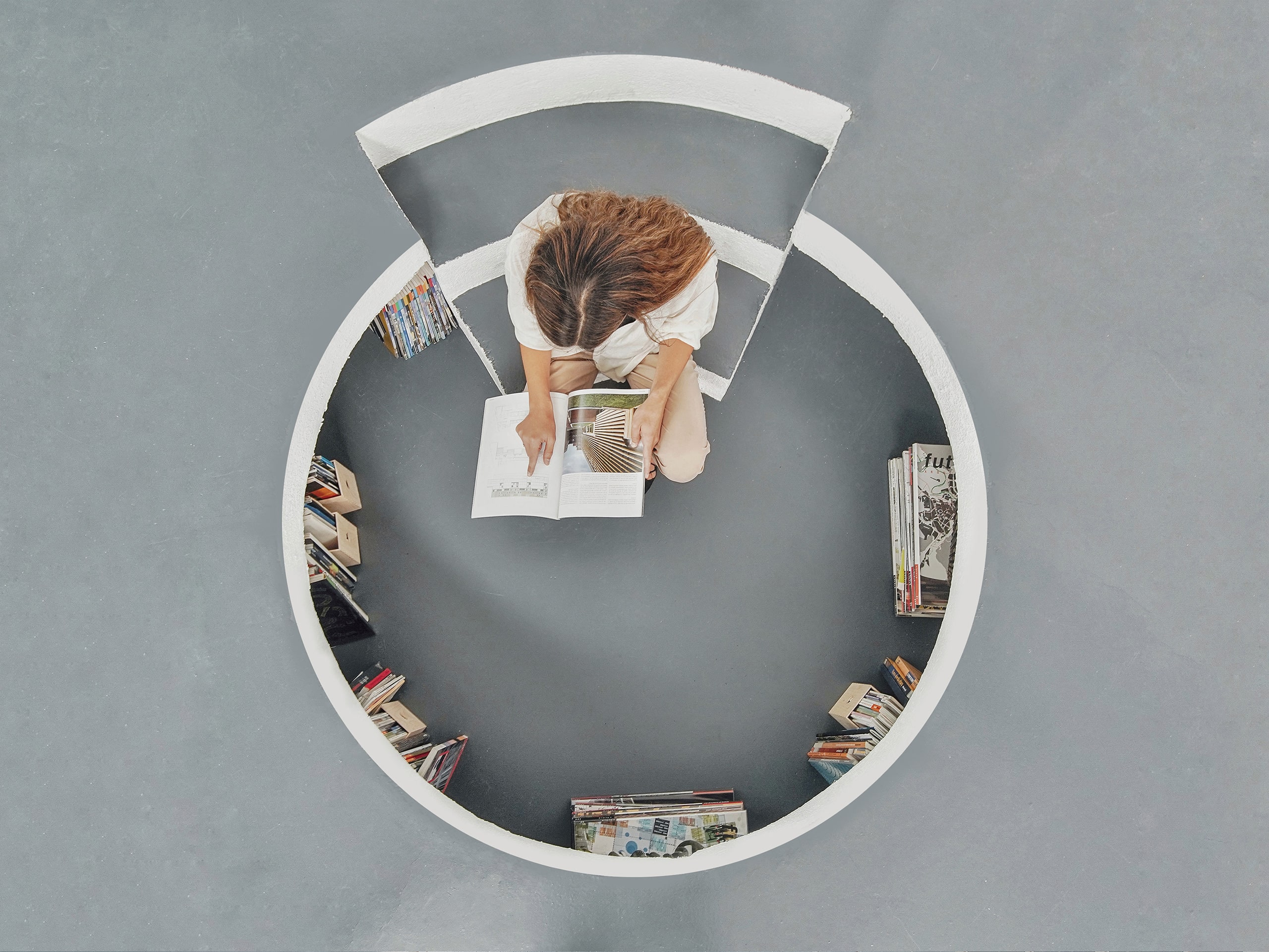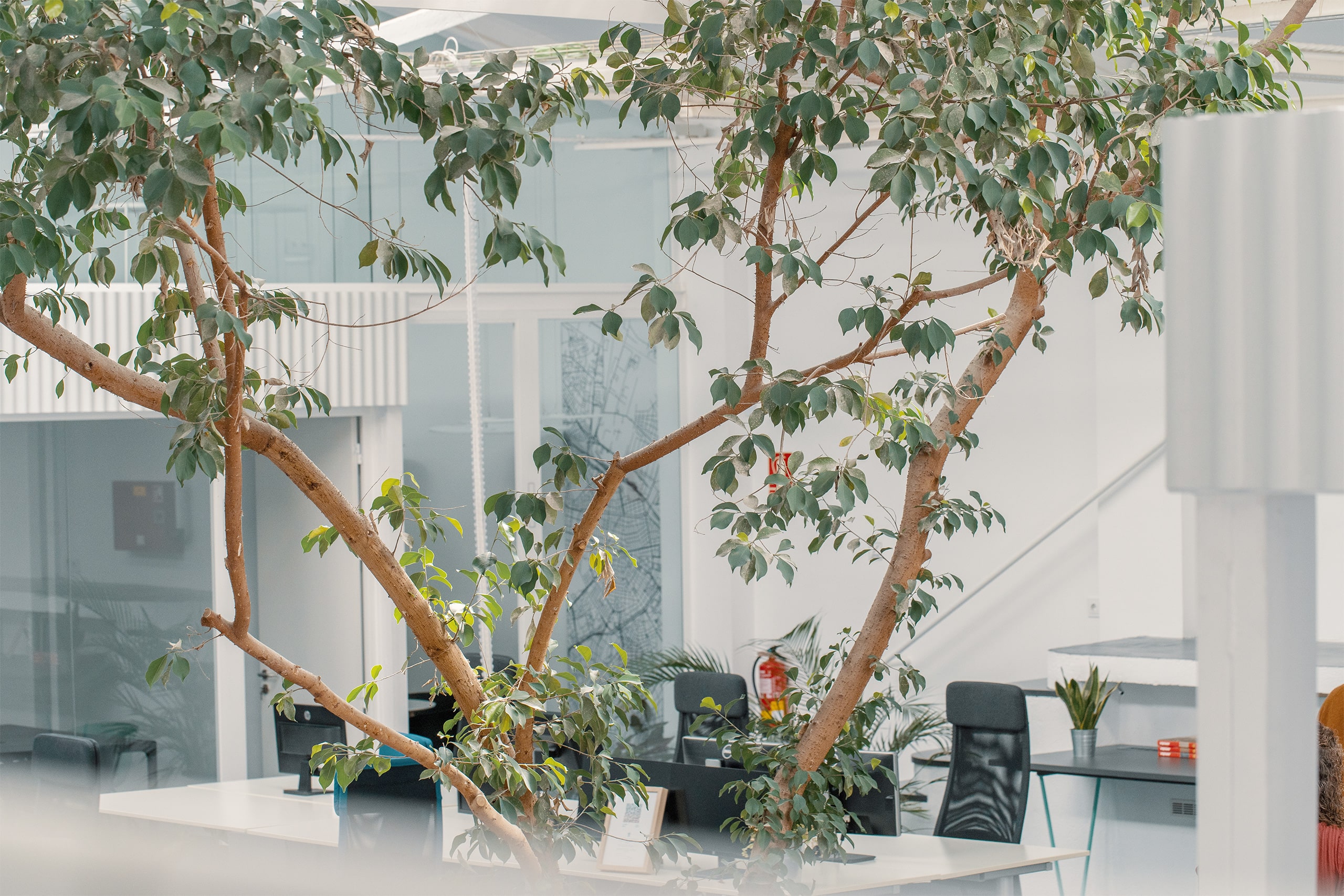 The taylor made and built in furniture was designed around the ficus -heart of the office- and around the different accesses, with curved shapes that contrast with the lineal structure of the building and that makes the cirulations easier through the warehouse and creating the new topography.