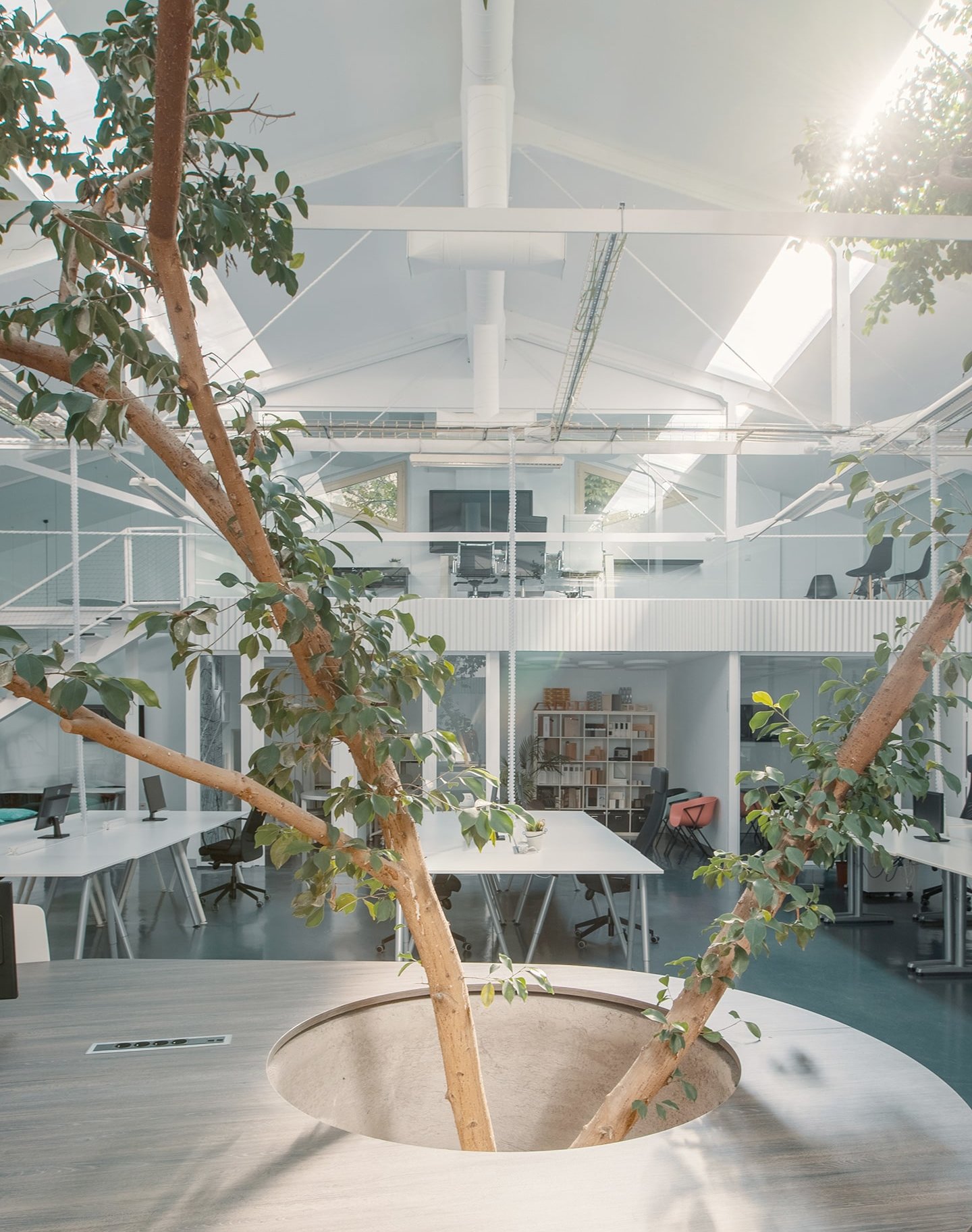 Los diferentes niveles, la transparencia y la vegetación fueron las principales herramientas para configurar y separar los diferentes espacios dentro de las oficinas, permitiendo no dañar ni ocultar el carácter industrial del lugar.