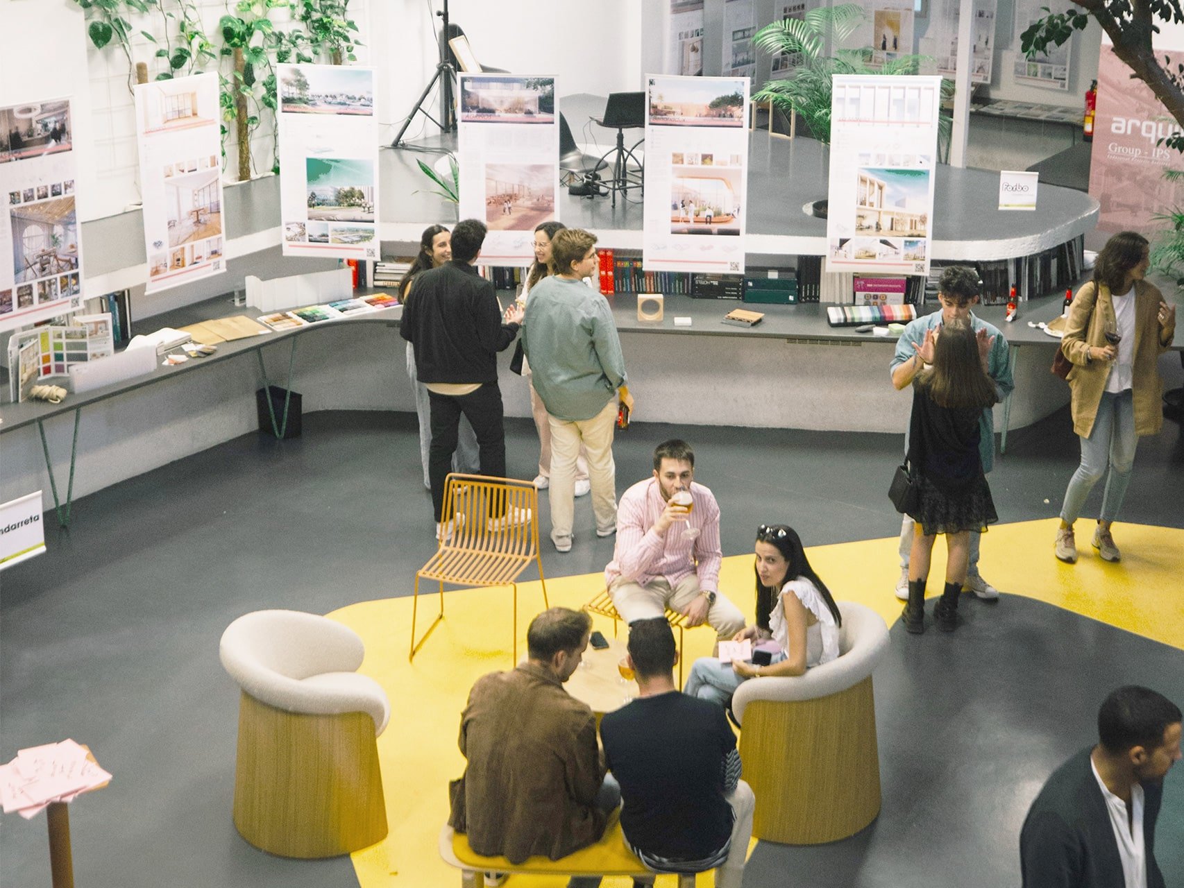 El mobiliario de obra y a medida se diseñó alrededor del ficus-corazón del proyecto- y de los distintos accesos, con formas curvas que contrastaran con la estructura lineal del edificio y que facilitaran las circulaciones por la nave, configurando la nueva topografía.